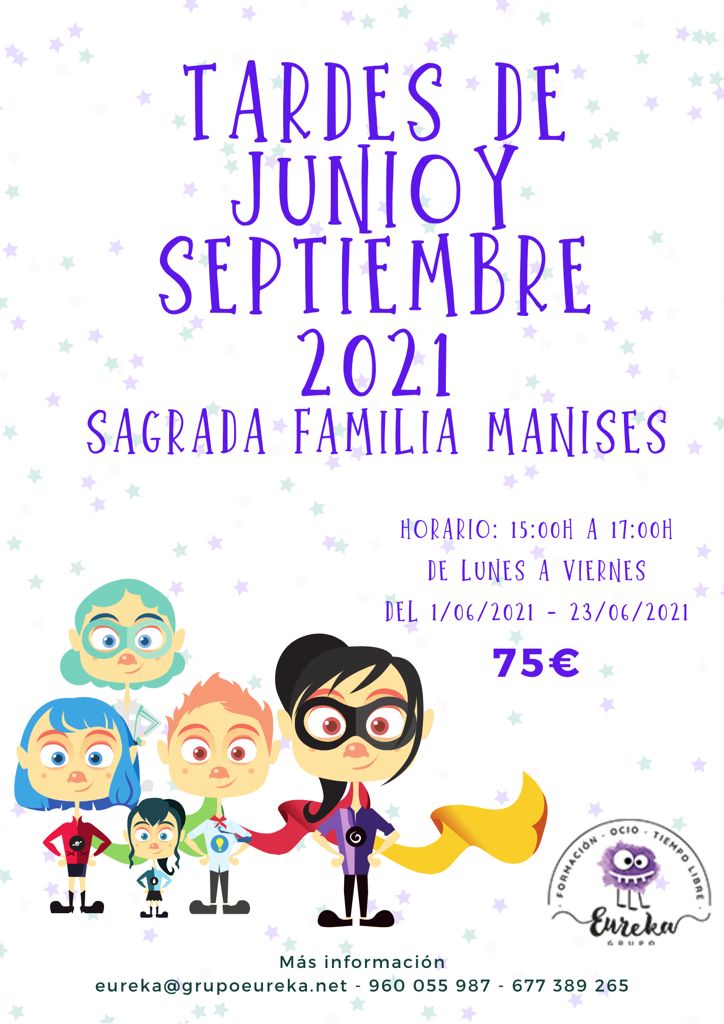 El colegio junto al grupo EUREKA, va a ofrecer la posibilidad de dar servicio las tardes de junio de 15 a 17 h. para facilitar la conciliación familiar. La propuesta de actividades es muy variada, ofreciendo diversión y desarrollo integral del alumnado. Estas actividades van dirigidas a los alumnos/as de educación infantil y primaria.
