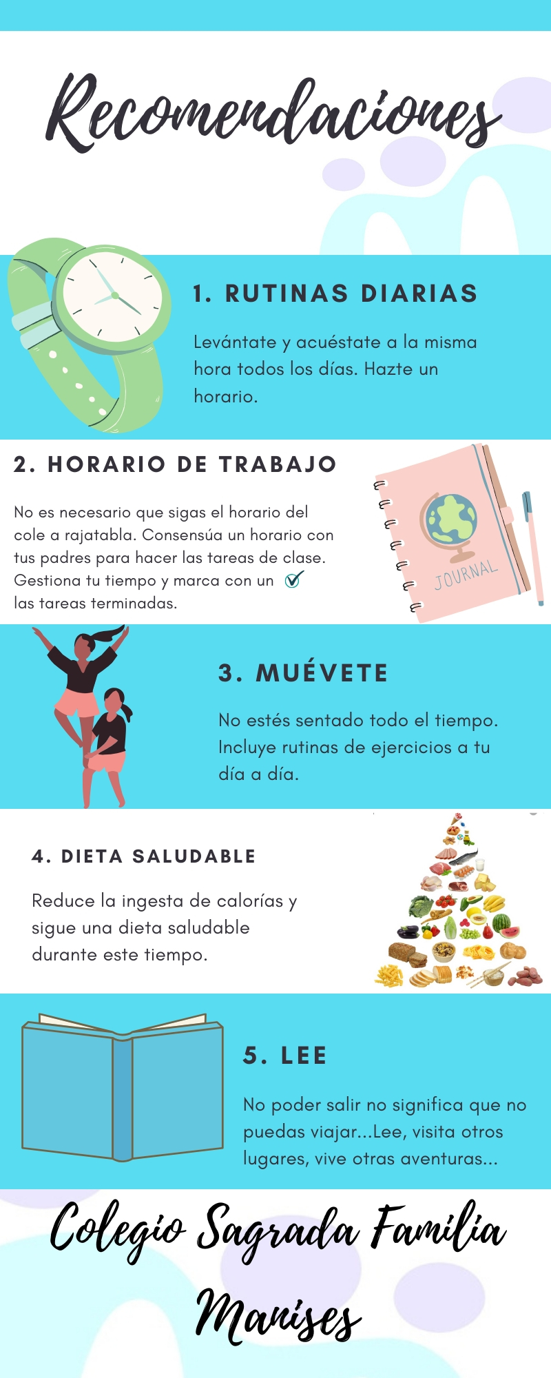 En esta situación tan extraordinaria que nos toca vivir es importante, que cumpliendo con responsabilidad la principal tarea que se nos ha encomendado que es quedarnos en casa, pongamos en práctica una serie de recomendaciones para sobrellevar la cuarentena y seguir mirando hacia delante. Recordemos también que participar en gestos de solidaridad y compartir en familia nuestras emociones y sentimientos hará que todo esto resulte más llevadero. ¡Ánimo a todas las familias!